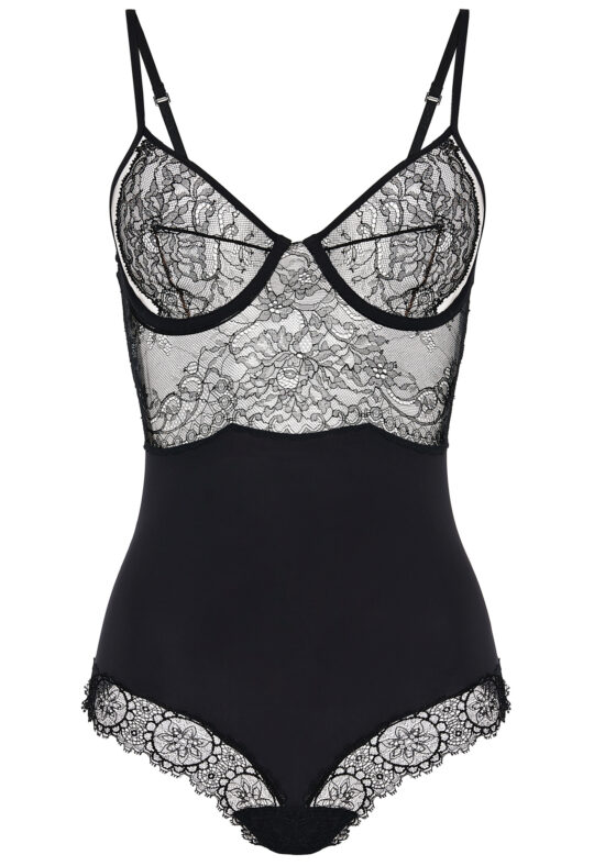 Be the first to review “Underwired Bodysuit in black Lycra with Leavers lace”